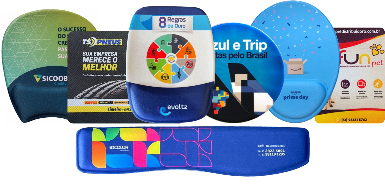 Nosso portfólio inclui mouse pad ergonômico, apoio de punho, mouse pads básico e conformado, lacres de garantia e etiquetas personalizadas — todos com personalização da sua marca e prazos ágeis.